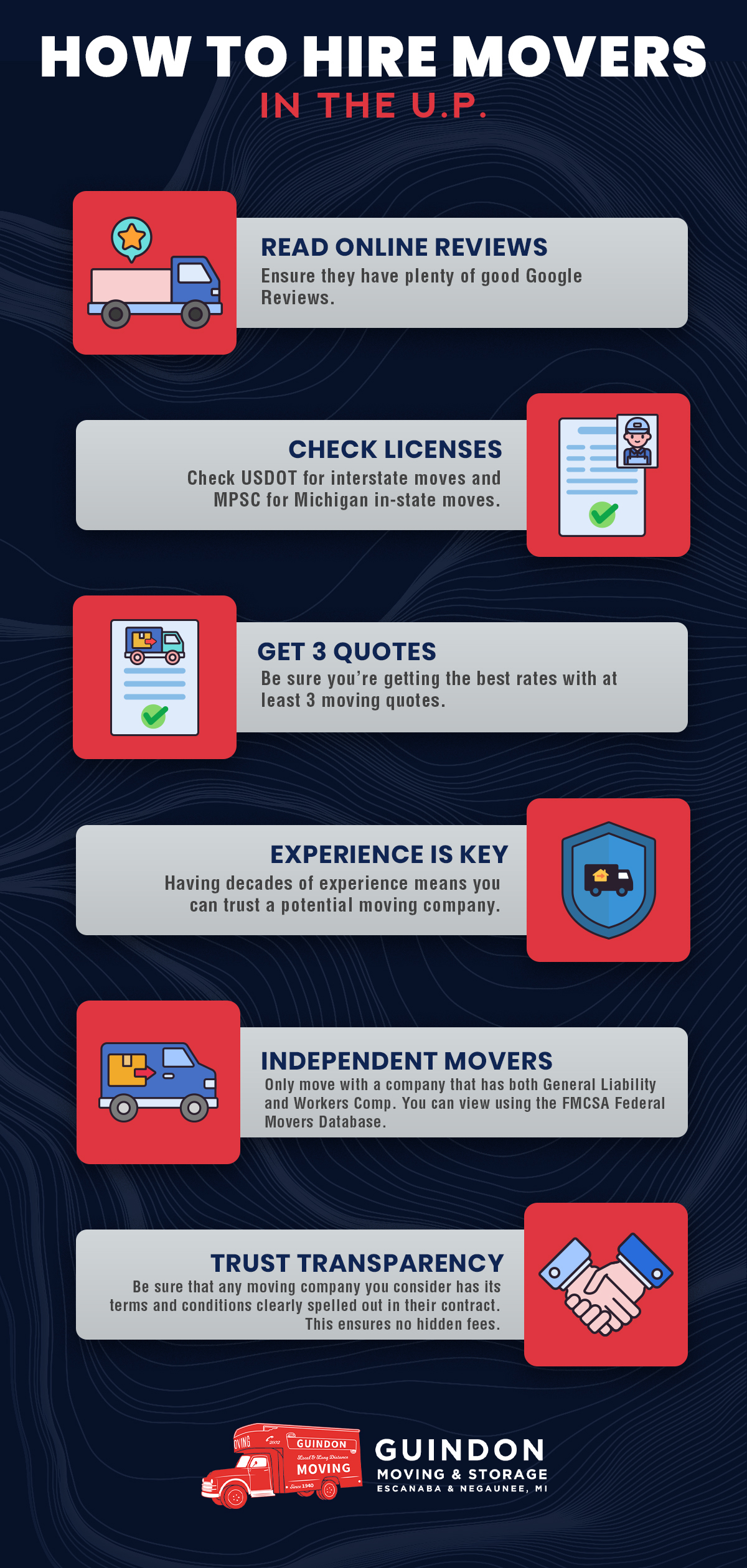 At Guindon Moving & Storage, we pride ourselves on our transparency and honesty, which is why we offer free, no-obligation estimates to all our customers. “Our comprehensive estimates detail all costs and services involved in your move, ensuring no hidden fees or surprises, so you have all the information you need to choose the right mover for you,” states Owner and President Scott Jensen, who has over 30 years of experience at Guindon. Fill out our free estimate form or call us at our Escanaba [phone_esc] or Marquette/Negaunee [phone_neg] locations to schedule your free estimate.